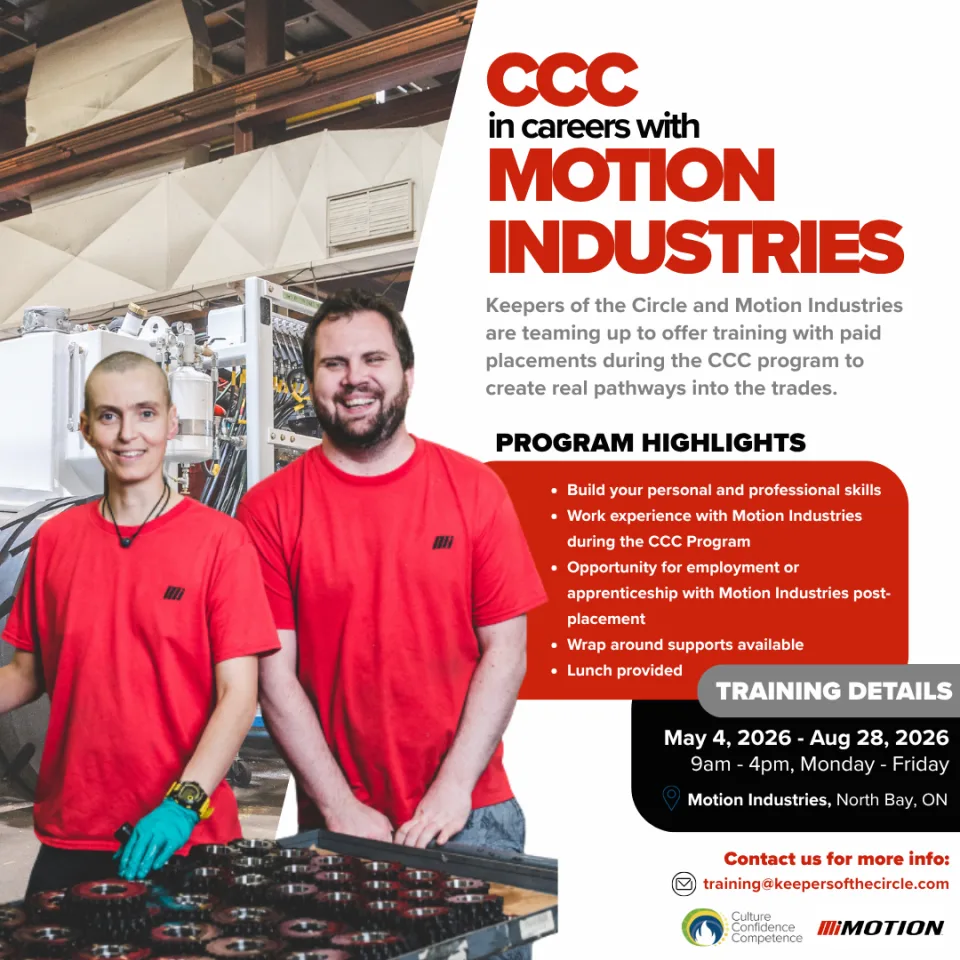 Keepers of the Circle has partnered with Motion Industries to host a 7-week session of our pre-employment training program, Culture, Confidence, and Competence, paired with a 10-week paid work placement. This is an opportunity to build a career in industrial equipment manufacturing, including potential apprenticeship sponsorship.