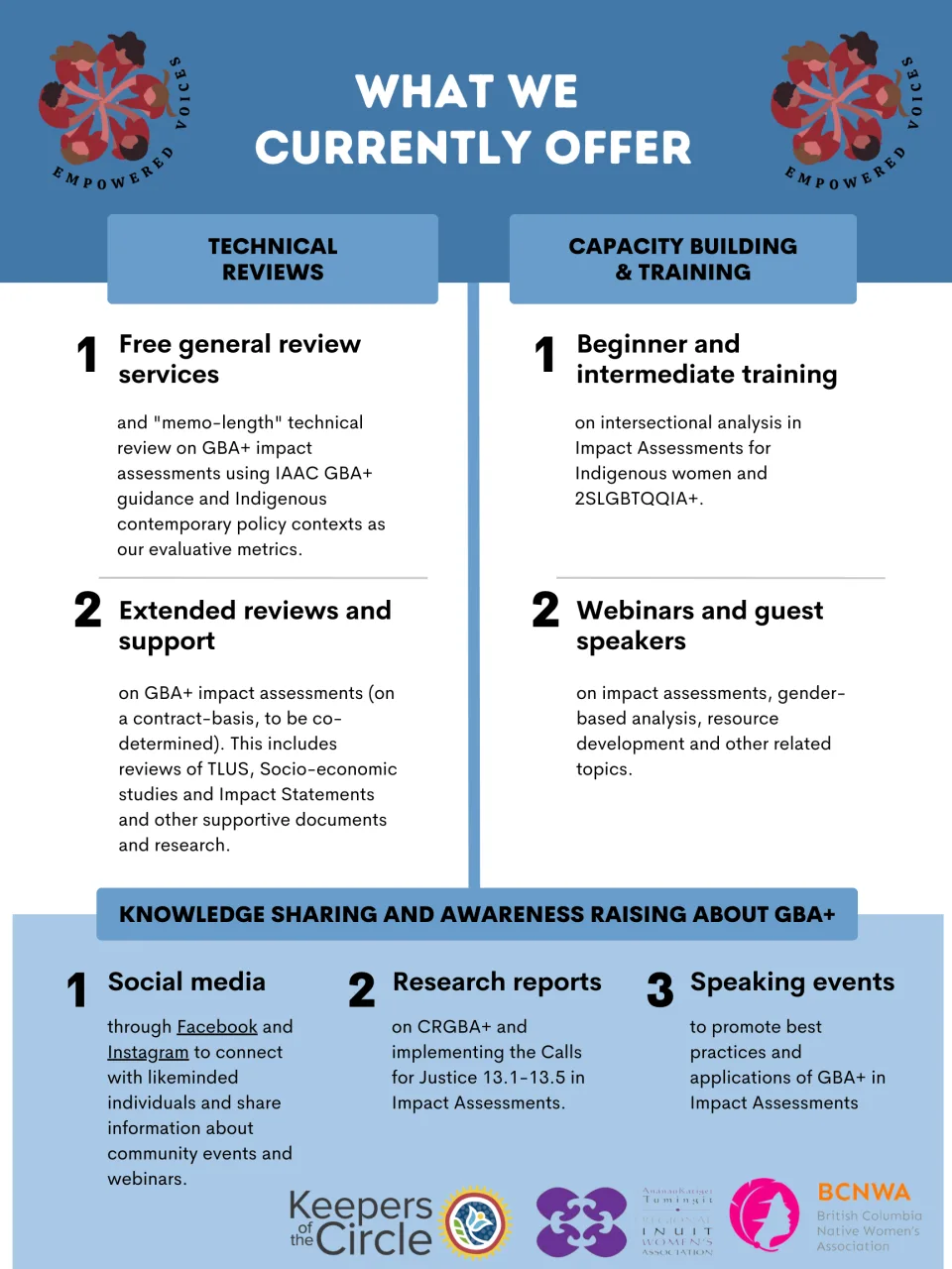 The Empowered Voices Project advocates for Indigenous women and 2SLGBTQQIA+ voices and usage of gender-based analysis plus in federal impact assessments. The goal of the project is to promote long-term, consistent IA participation that is informed directly by grassroots Indigenous women and gender diverse peoples, led by a network of female leaders in their respective communities. We work in collaboration to deliver our training programs and knowledge sharing events, and to facilitate a community engaged research project to co-develop guidance documents for developers and communities to support EDI and CRGBA+ tools to implement in order effect better outcomes for historically marginalized groups.